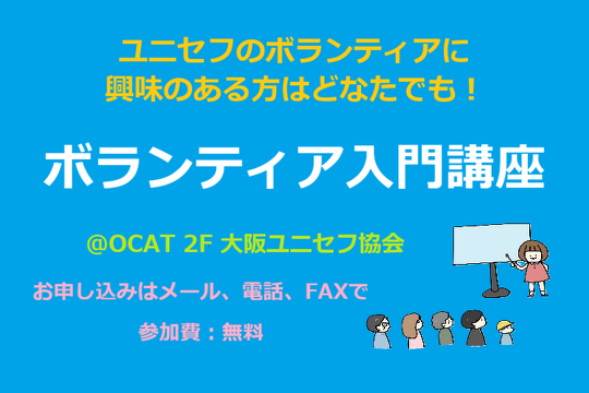 大阪ユニセフ協会の活動はすべてボランティア・メンバーにより支えられています。 ボランティアには、誰でも何時でも参加できます。参加に資格や制限はありません。現在100名以上のボランティアが登録し、積極的に活動しています。世界の子どもの問題に関心のある方、ユニセフの活動に関心のある方、支援が必要な 世界の子どもの為に何か協力したいと考えている方はぜひお問い合わせください。