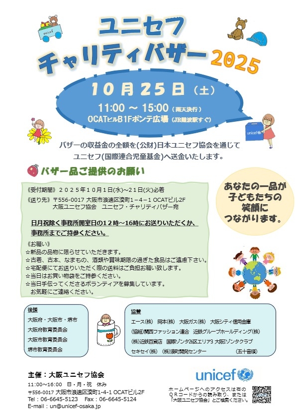 送り先:〒556-0017 大阪市浪速区湊町1-4-1 OCATビル2F 大阪ユニセフ協会 ユニセフ・チャリティバザー宛