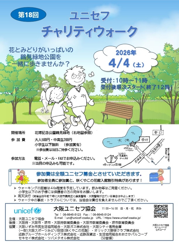 大阪ユニセフ協会では今年も恒例の「第18回ユニセフ・チャリティウォーク」を花博記念公園鶴見緑地にて開催します。