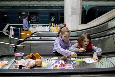 ハリコフの地下鉄駅構内で絵を描くイリーナ(9歳)とオレナ(7歳) 安全のため家族とともに地下シェルターに避難している(ウクライナ) © UNICEF/UN0634455/Gilbertson