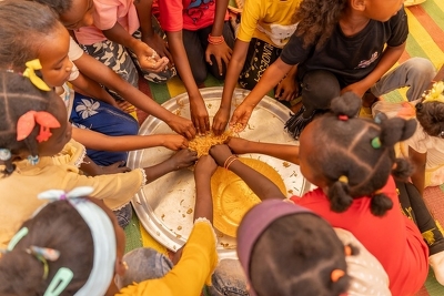 (c)UNICEF/UNI580353/Elfatih ユニセフが支援するオムドゥルマンの共同キッチンで調理された料理を食べる子ども たち(イエメン)
