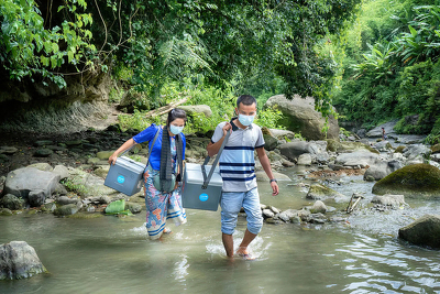 © UNICEF/U.S. CDC/UN0723042/Fabeha Monir ボートを降りた後、徒歩で山道を進む保健員のウバヒネ(右)と同僚(バングラデ シュ)