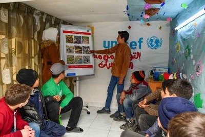 © UNICEF/UNI730608/Shahan ユニセフの支援で設置された「子どもにやさしい空間」で、爆発物に関する啓発のワークショップに参加するモハメドさんと子どもたち。(シリア、2025年2月撮影)