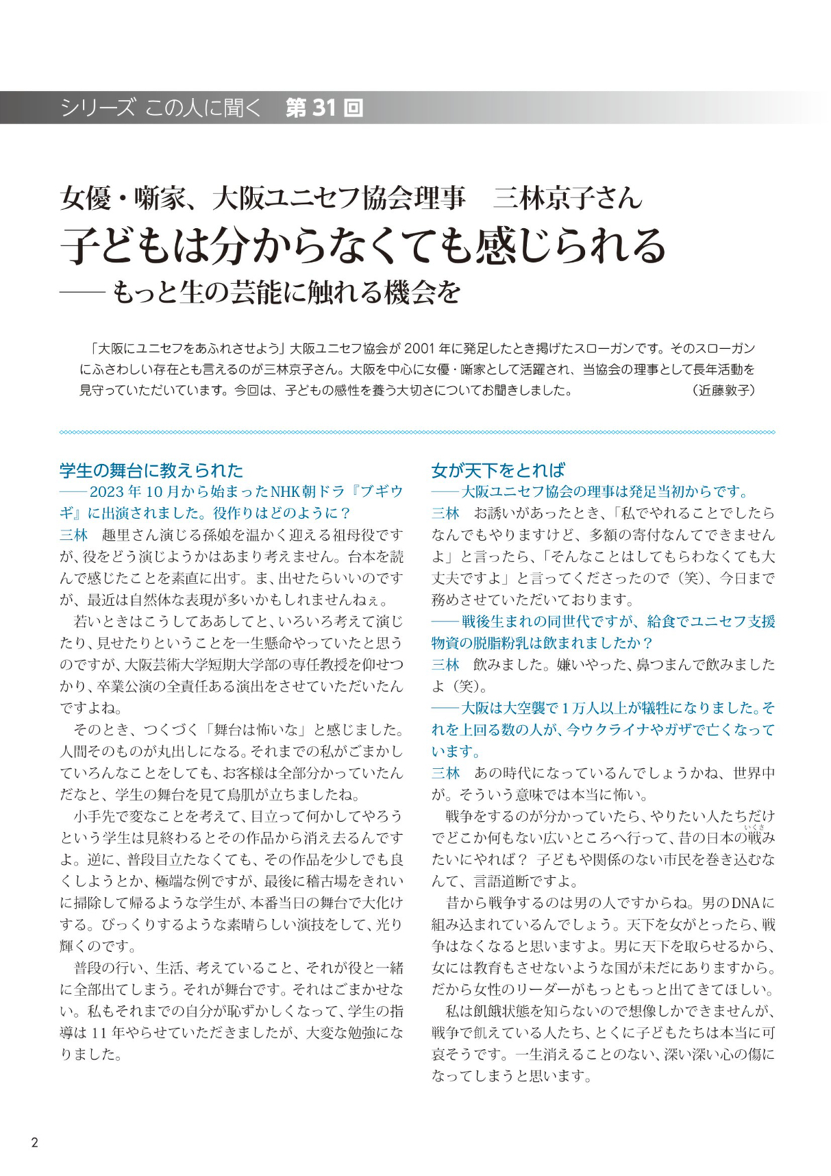 2024/5/24 大阪通信 おしらせ・イベント情報 大阪通信No.94号を発行しました 大阪ユニセフ協会のニュースレター「大阪通信」のNo.94号を発行しました。 今号の「シリーズ この人に聞く 第31回」(P2・P3)は、大阪を中心に女優・噺家として活躍され、 当協会の理事として長年活動を 見守っていただいている三林京子さんにお話を伺いました。 そのほか、明日へ「わたしもボランティア」など内容盛りだくさんです。 本誌ご希望の方は大阪ユニセフ協会まで。